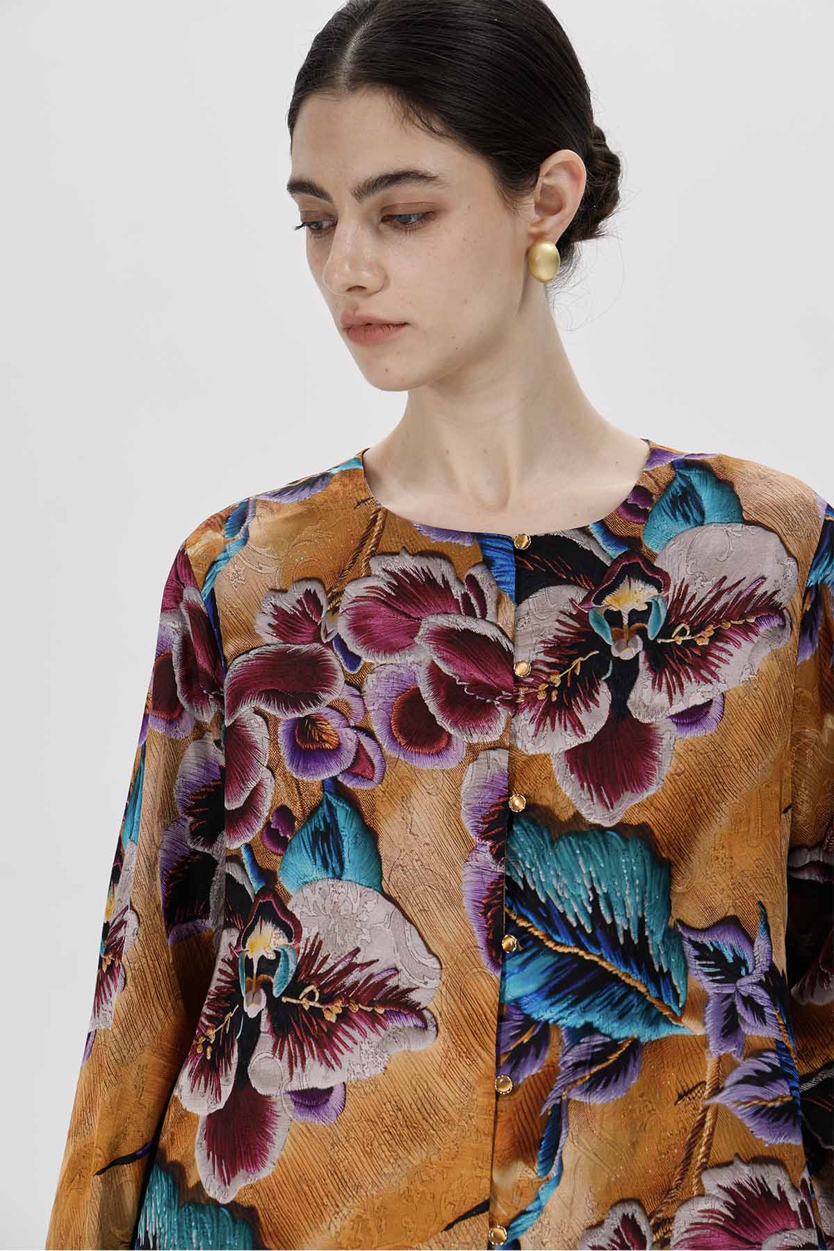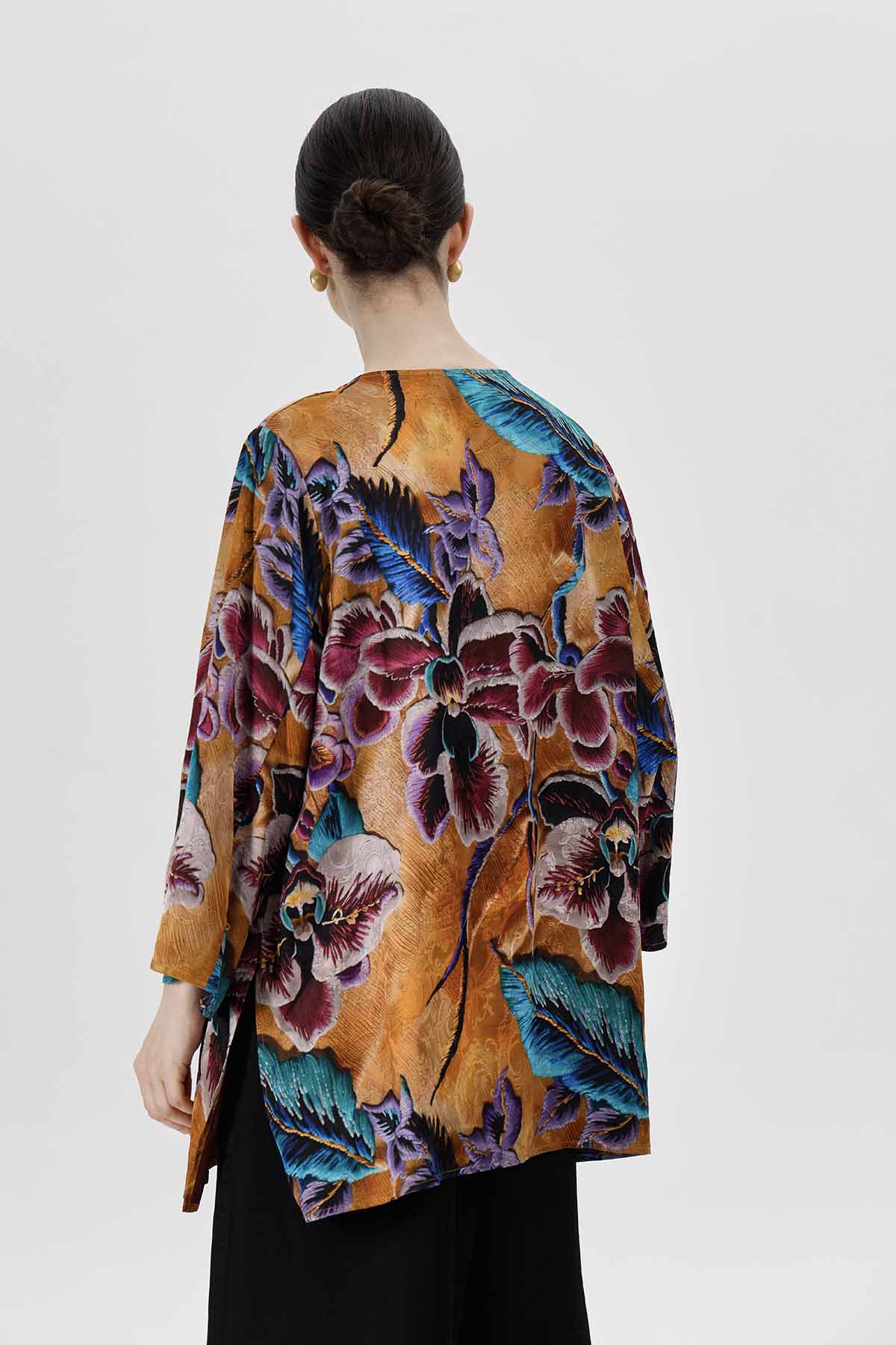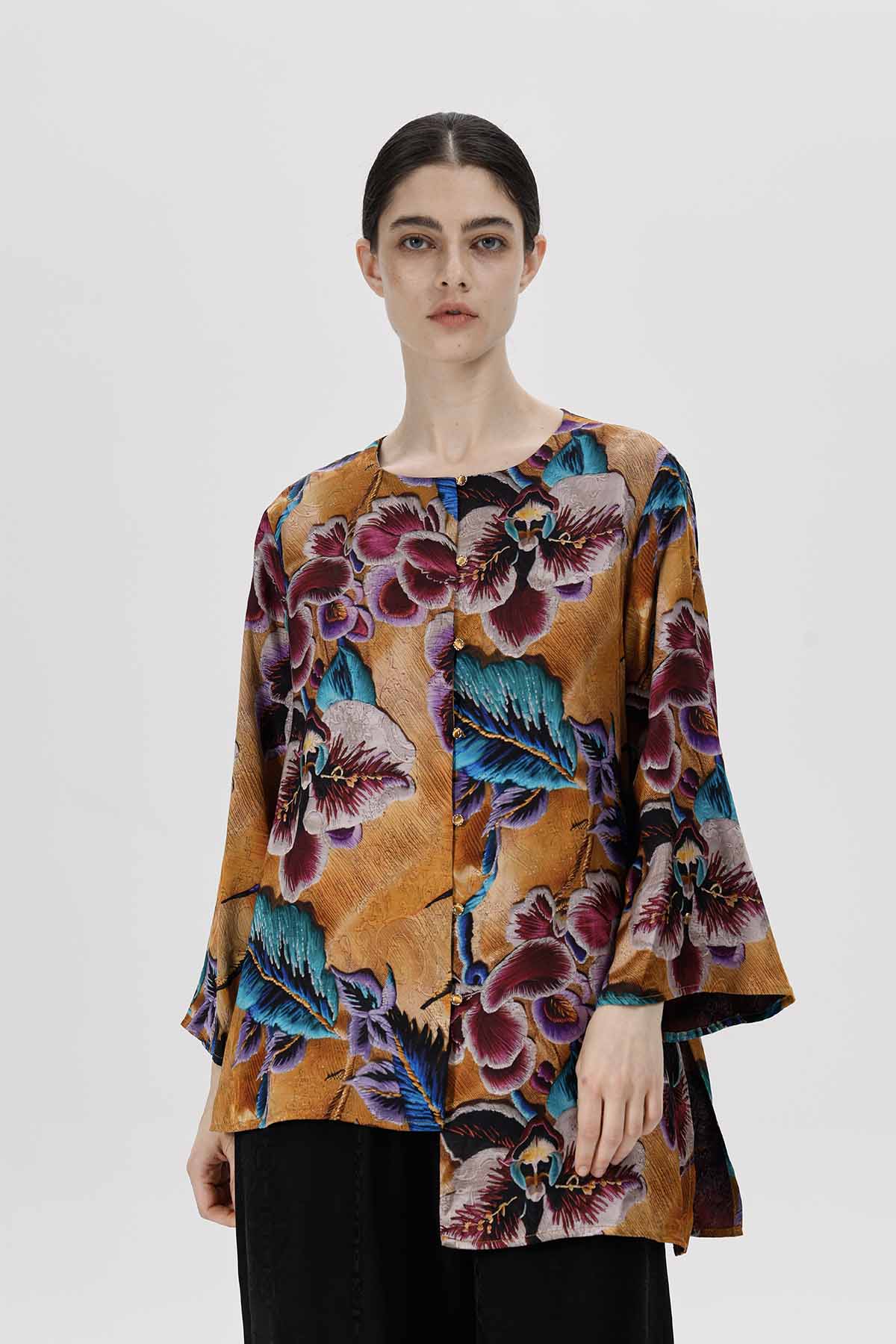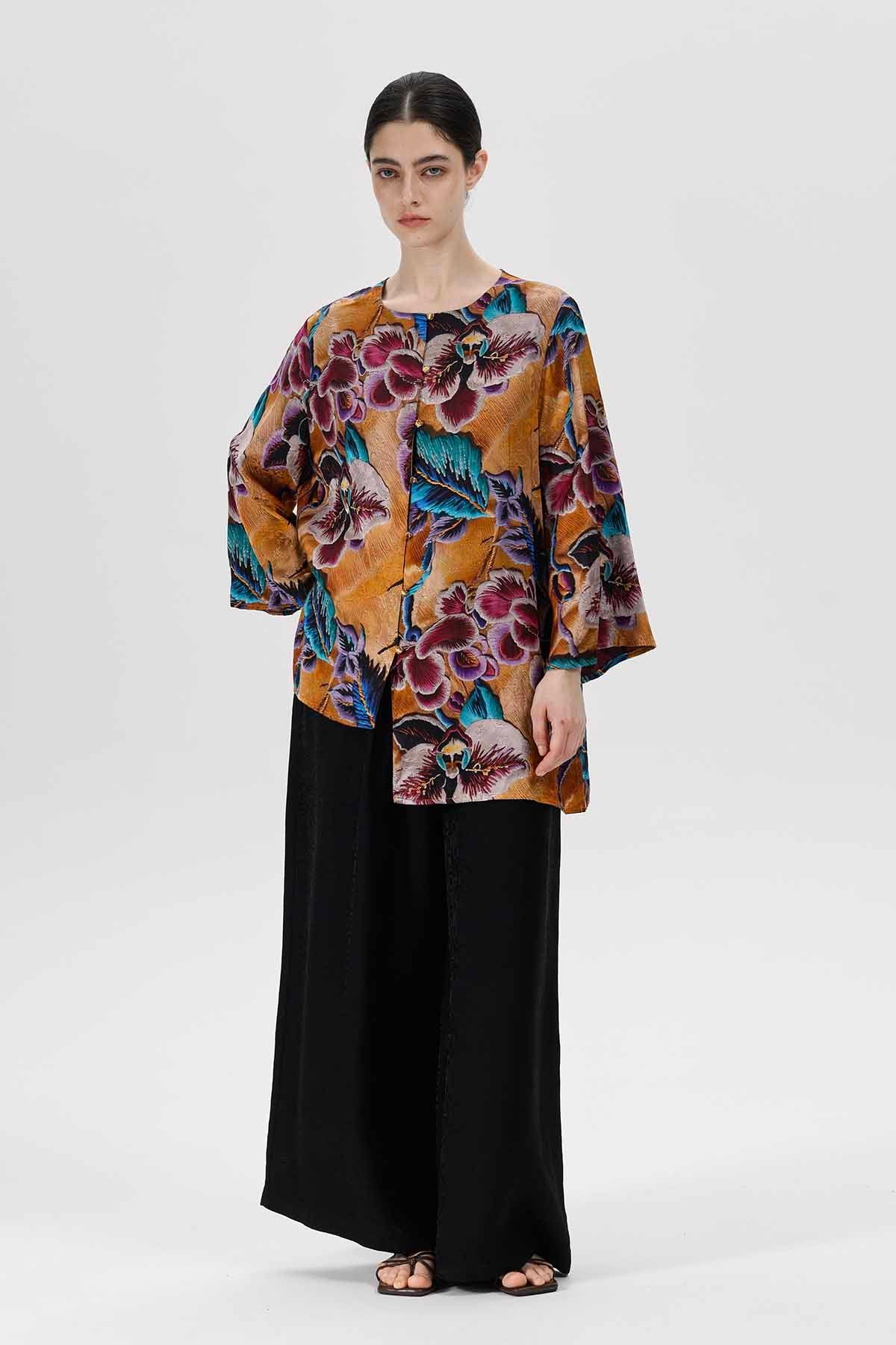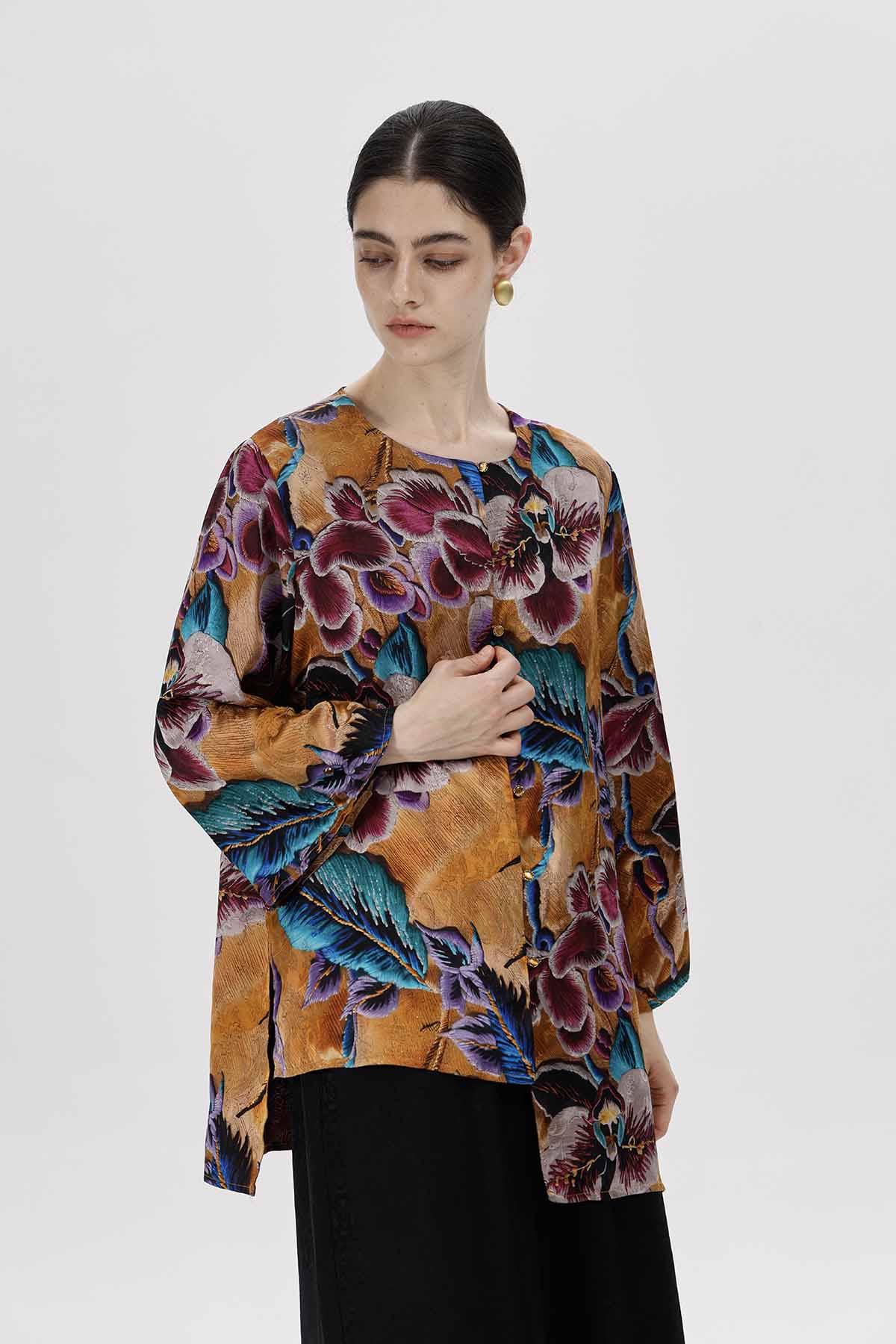 بلوزة فضفاضة بنقشة زهور نابضة بالحياة، مصممة بجزء أمامي غير متماثل لإضفاء لمسة مميزة. يتميز قماشها بنعومته وانسيابيته التي تتناغم مع حركة الجسم.