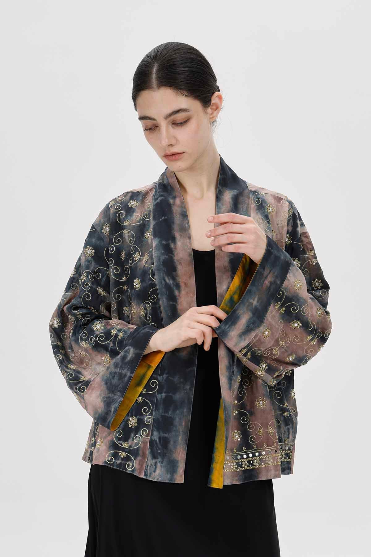 صُنعت هذه السترة من الحرير الخالص، وتتميز بخفة وزنها وانسيابيتها مع ملمس ناعم ينسدل بانسيابية على الجسم. يضفي النسيج لمعة خفيفة تُبرز جمال الألوان مع الحفاظ على تهوية جيدة وراحة مثالية لارتدائها فوق طبقات أخرى من الملابس.