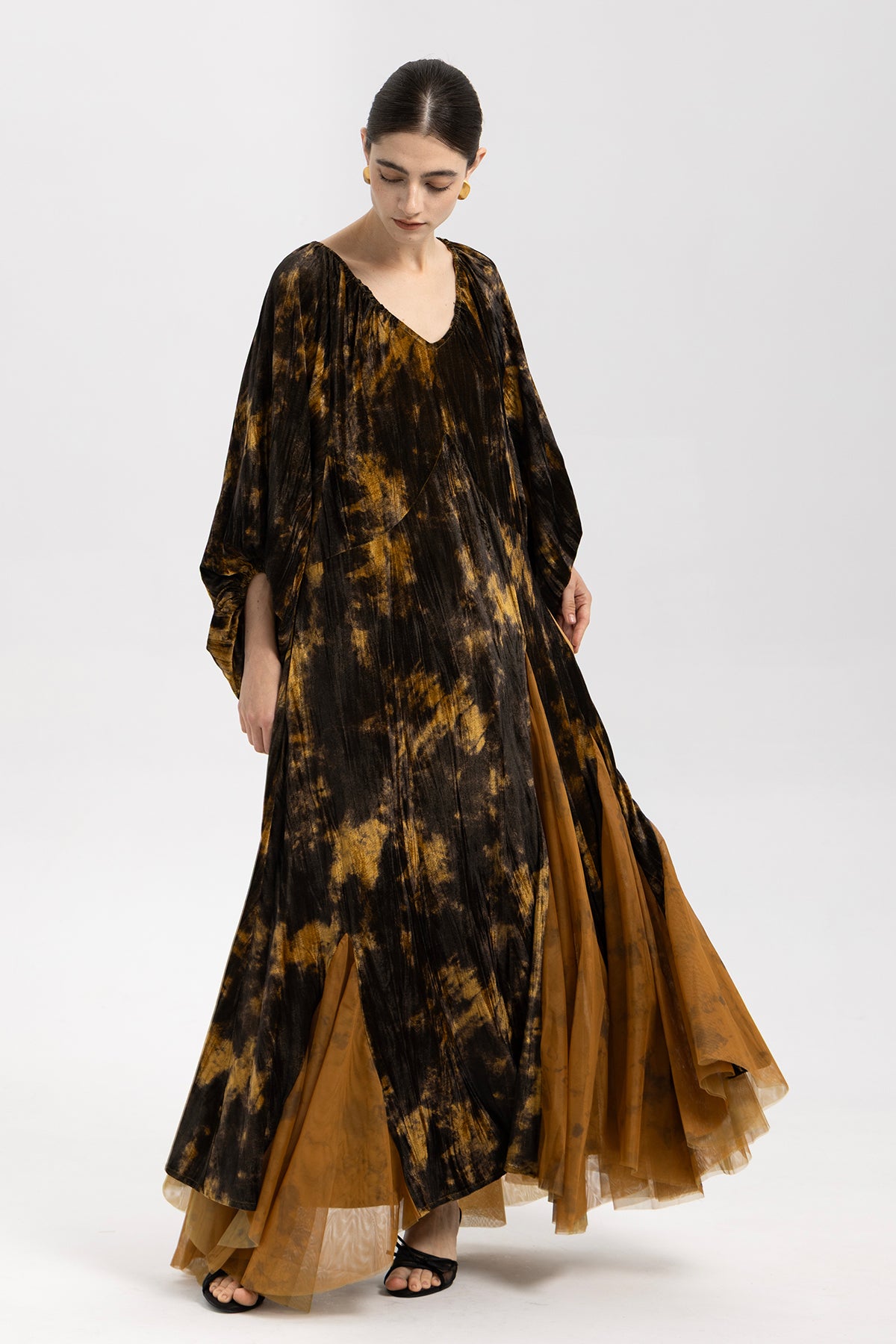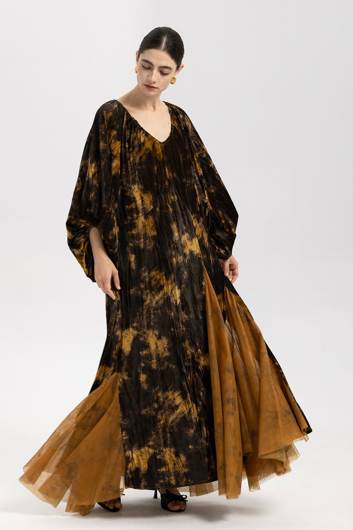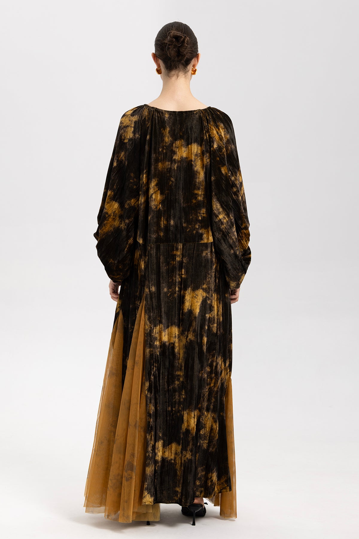 Amber Smoke Velvet Mesh Splice Maxi Dress
