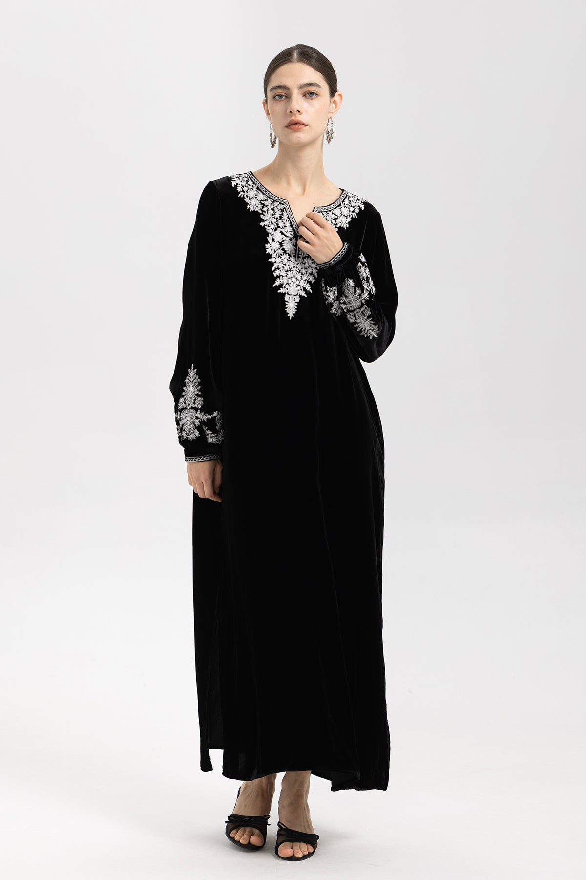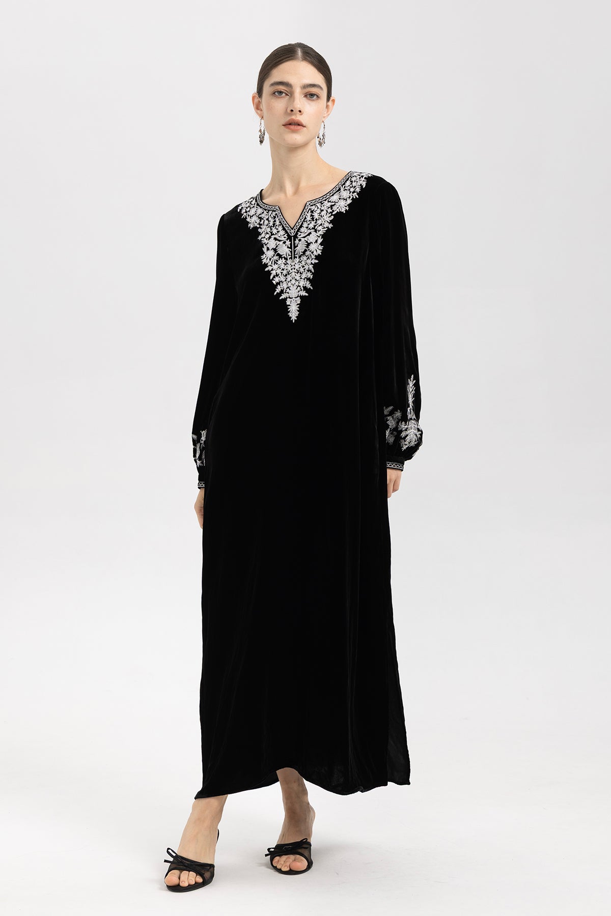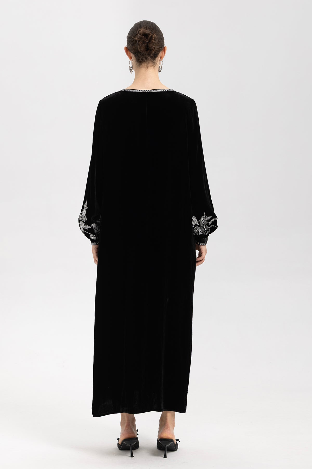 Noir Velvet V-Neck Embroidered Maxi Dress