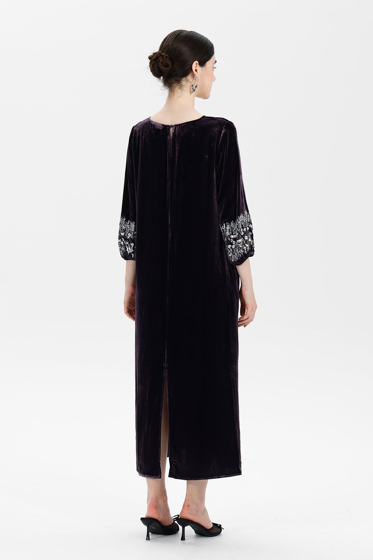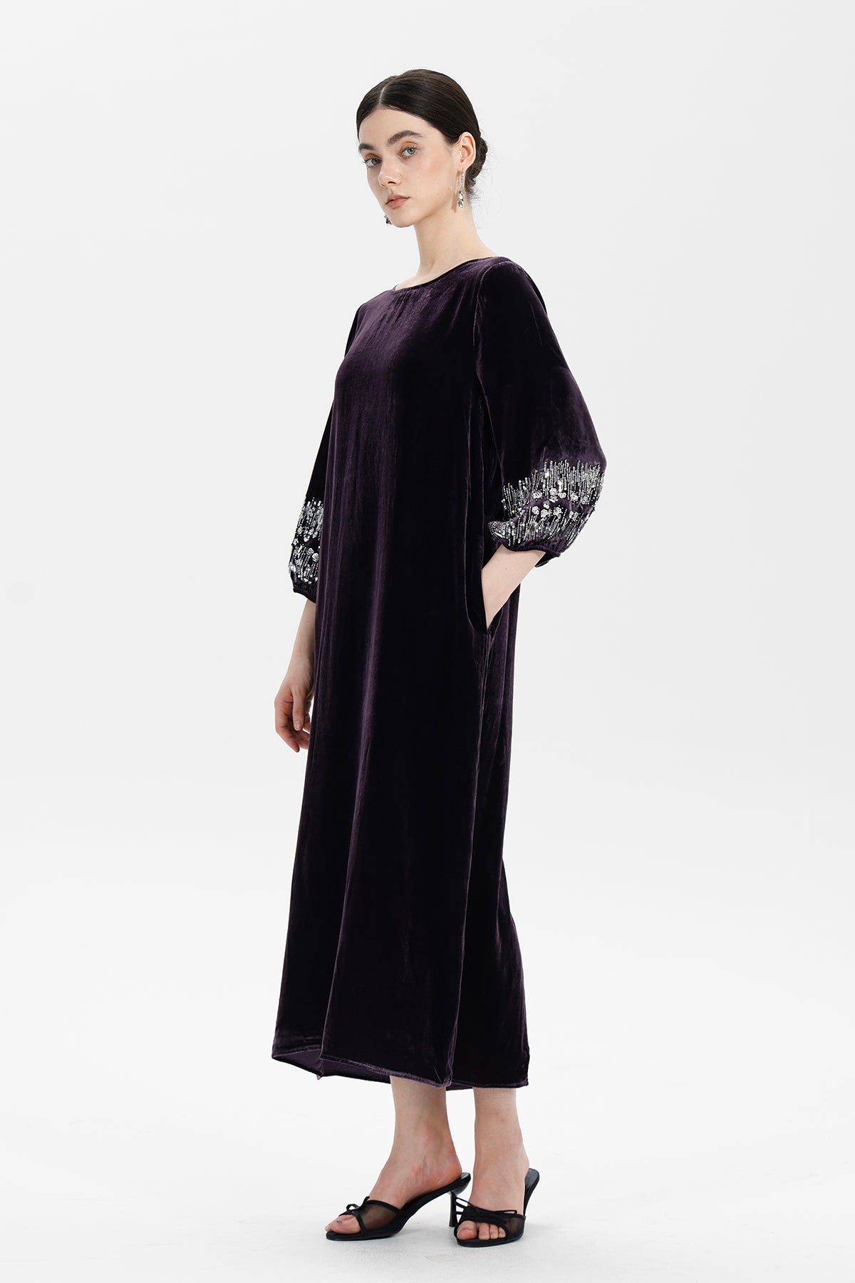 Minimal lines meet considered detail — the Renee dress is cut in silk velvet with embellished sleeves. Beads and sequins provide a subtle shimmer, balancing the relaxed fit. Designed for effortless wear from dinner to celebration.