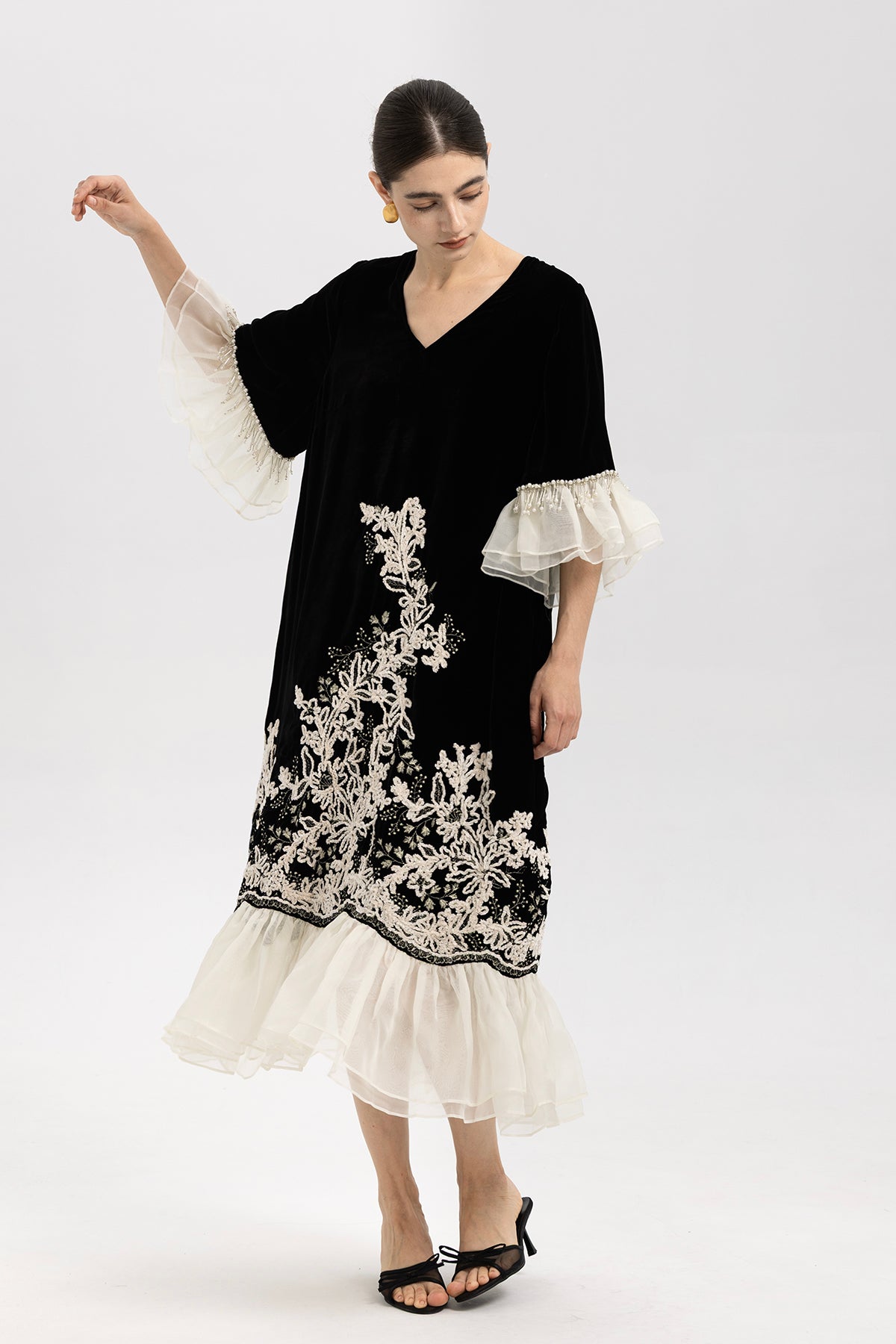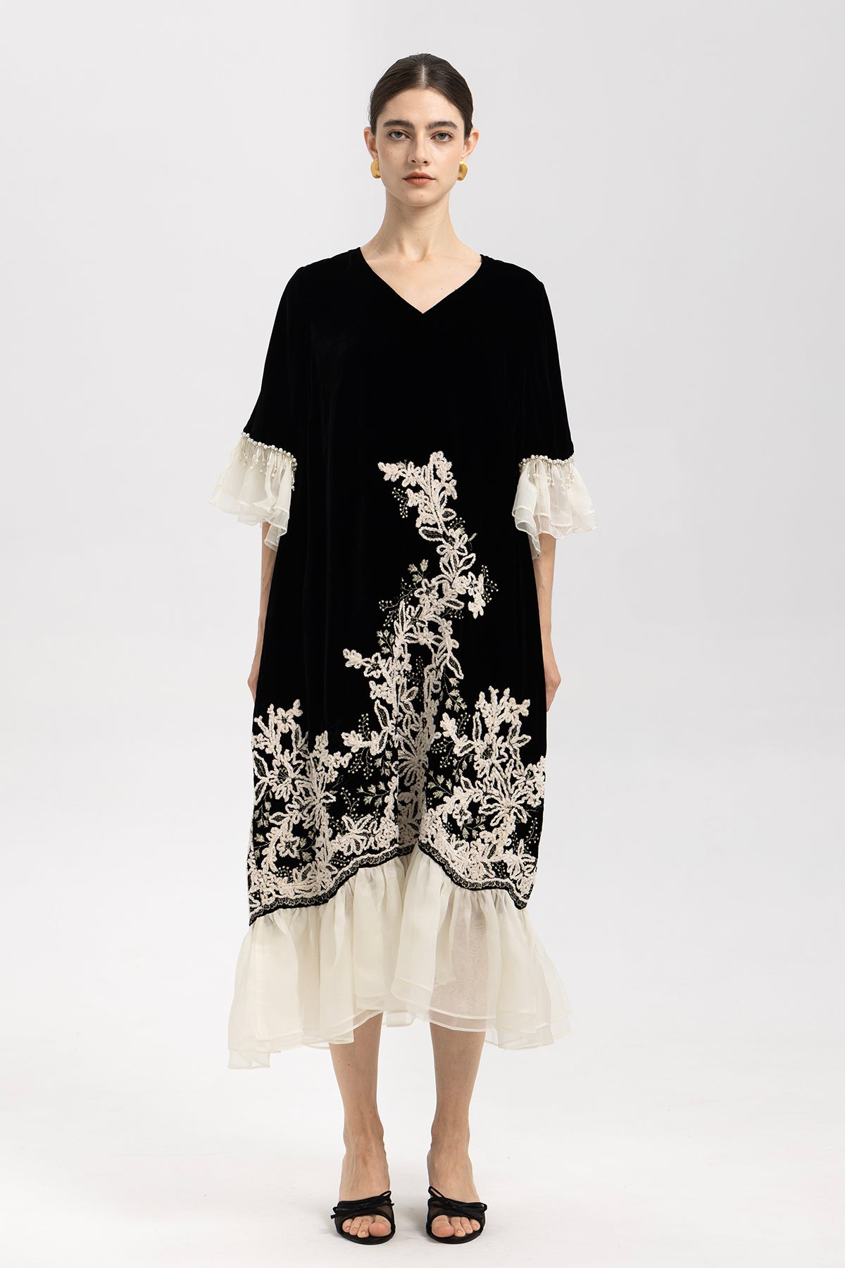 Elowen Embroidered Velvet Ruffle Hem Dress